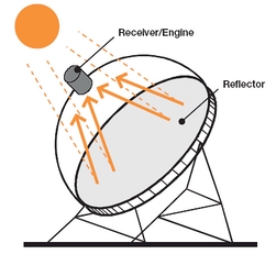 Un reflector con forma de antena parabólica se utiliza para concentrar la luz solar en un receptor situado en el punto focal del plato.