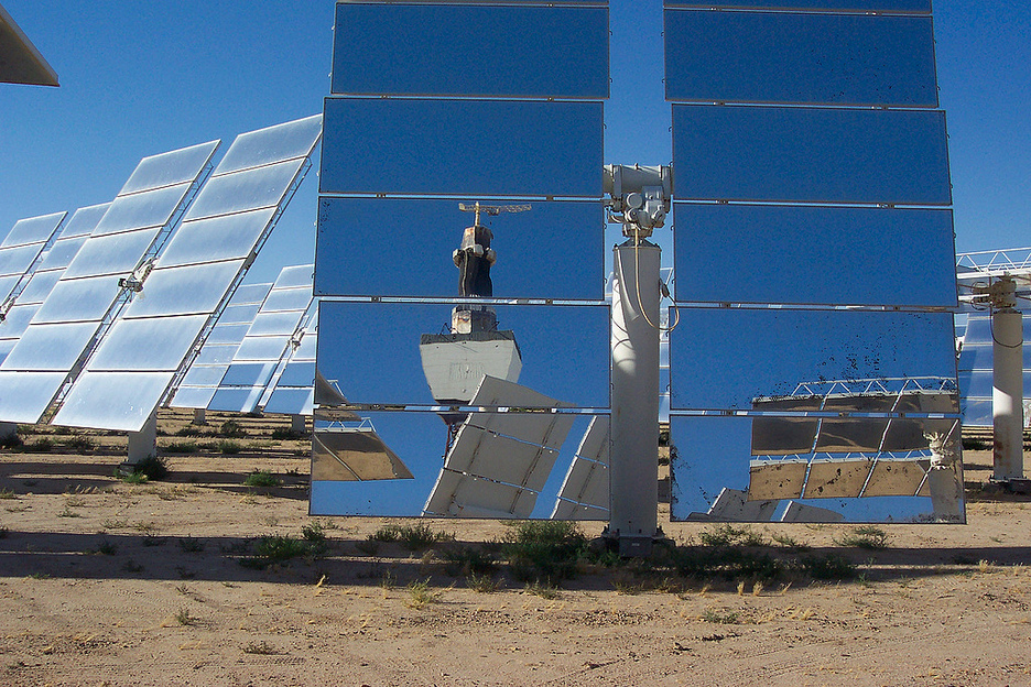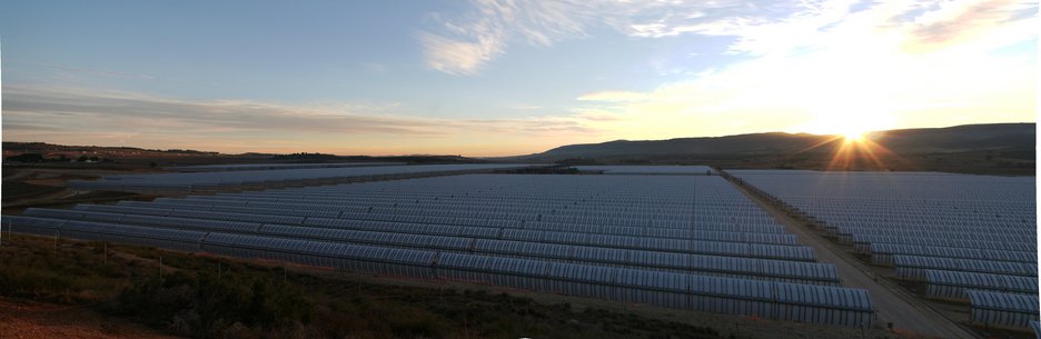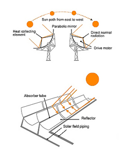 Unos espejos de forma parabólica, dispuestos en largas hileras en los campos solares de la central, reflejan la radiación solar incidente concentrándola en un punto hasta 80 veces sobre un tubo absorbedor, en el que un fluido caloportador es calentado a alta temperatura. A continuación, en un intercambiador de calor alojado en bloque central de la instalación, se produce el vapor que impulsa las turbinas convencionales y genera la electricidad.
